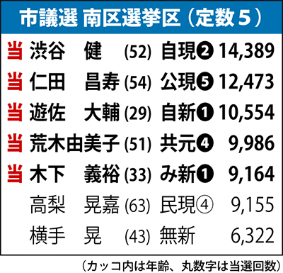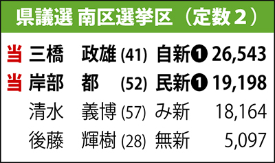 10日に投開票が行われた市議選南区選挙区(定数5)は、自民党・渋谷健氏、公明党・仁田昌寿氏の現職2氏が上位を占めた。共産党の元職・荒木由美子氏が返り咲き、自民党・遊佐大輔氏、みんなの党・木下義裕氏が初当選を決めた。民主党の現職・高梨晃嘉氏は9票差で議席を失い、無所属で民主党推薦の横手晃氏とともに民主党系候補が共倒れとなった。県議選(定数2)は自民党・三橋政雄氏、民主党・岸部都氏の2人が初当選を決めた。