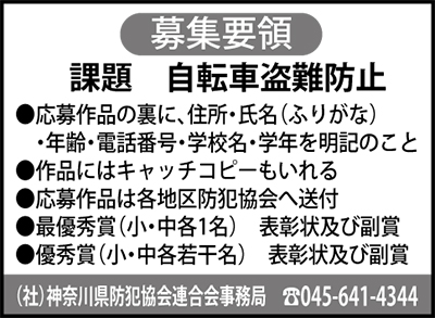 自転車盗難の被害が後を絶たないことから、神奈川県防犯協会連合会と神奈川県自転車防犯協会では、自転車の盗難防止啓発ポスターの募集を行っている(後援・神奈川県警察)。