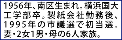 仁田 高齢化が進む南区の姿は未来の横浜の姿でもある。次の時代を視野に入れた少子高齢人口減少社会のモデルとして、低炭素社会の環境未来都市を目指していきたい。高齢者、障害者、子育て、教育などの分野の問題を少ないエネルギーで下支えできるよう、介護用ロボットの普及などに取り組みたい。