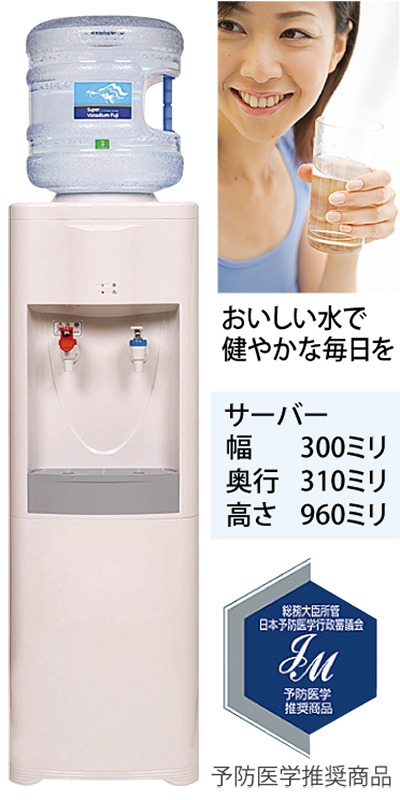 「スーパーバナジウム富士」は富士山の地下253メートルから採水した100%天然水の宅配サービス。冷水(約5℃)と温湯(約85℃)機能付きサーバーは月々の使用料840円。12リットルのボトル1本1575円(割引プランは1365円)。2008年には総務大臣所管、日本予防医学行政審議会の推奨商品に認定されている。ボトルはラック付きで宅配されるので災害時の備蓄用にもなる。