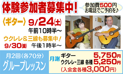 ウクレレや沖縄三線教室が評判の同会が、今月からギター教室を開講。働く人でも通いやすい土曜日の日程があるのも魅力的。また教室の楽器を無料で使えるので、手ぶらで通うこともできる。