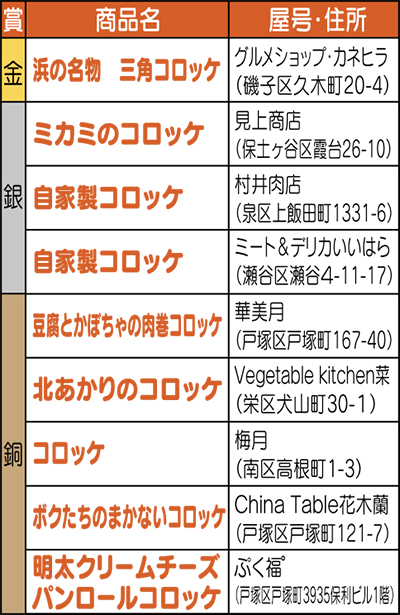 5ヵ月の投票期間中に5790票が寄せられた。その結果、1位となる金賞には「グルメショップ・カネヒラ」(磯子区・浜マーケット)の「浜の名物 三角コロッケ」が選ばれた。三角形のユニークな形と先々代から受け継がれているこだわりの味が幅広い支持を集め、1043票を獲得した。