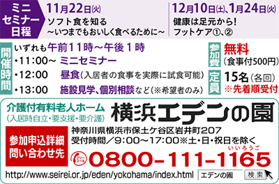 JR・保土ヶ谷駅が最寄の介護付有料老人ホーム『横浜エデンの園』(原田さち子園長)で今月22日(火)、生活に役立つ知識などを身に付ける事ができる「ミニセミナー」が行われる。