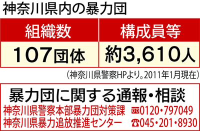 昨年4月、神奈川県は同じ趣旨の条例を既に施行している。施策としては、暴力団排除に取組んだことにより、団員から危害を加えられる恐れがある人の保護や、事務所の使用差止め請求訴訟を起こす人を県が支援することなどが盛り込まれている。