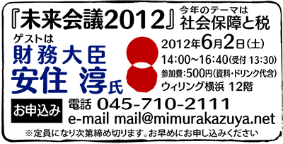 その上で、まさに責任世代の政治家として、社会保障の制度改革に私は正面から取り組んでいます。一方、私は大きな政策決定は有権者の皆さんと直接話をしながら行うべきだと考えています。そのため、毎年行っている参加型セミナー「未来会議」を一体改革の政策の責任者となる安住財務大臣をお呼びして開催します。是非ご参加ください。