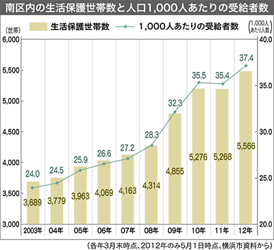 南区の人口1000人あたりの受給者数は37・4人。市全体では18・5人で、県内の市町村で最も多い湯河原町でも22・3人(10年度)となっており、南区の多さが際立っている。