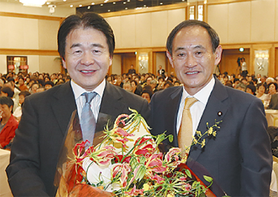 菅義偉衆議院議員の後援会が主催する集会が10月15日、西区のロイヤルパークホテルで開催され、1200人(主催者発表)が集まった。