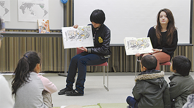 イベントでは同校の増田歳織さん、山岡眞子さんら3年生4人が子どもに絵本を読み聞かせる企画も行われ、『どろんこハリー』を日本語と英語で交互に朗読。子どもは絵本にくぎ付けになっていた。