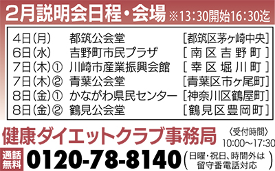今回は、健康ダイエットクラブの上席主任講師の太刀川先生などが教えてくれる。貴女もこれを最後に、