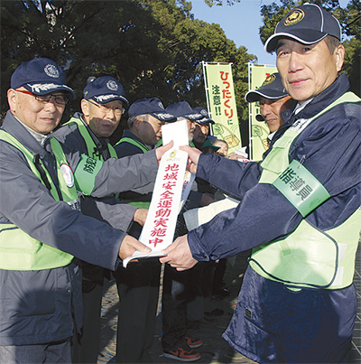 まず、南署員と防犯協会、防犯指導員、寿東部連合町内会のメンバーが横浜橋通商店街で、買い物客に自転車のかごに取り付ける防犯ネットやひったくりが増えていることを知らせるチラシを配った。その後、大通り公園で伊勢佐木防犯指導員らに「地域安全運動実施中」のたすきをリレー。受け取ったメンバーはイセザキモールで同じように啓発活動を行った。