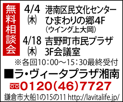 第三者の立場で有料老人ホームや高齢者住宅など各種施設を紹介するラ・ヴィータプラザ湘南が来月、「無料相談会」を行う。会場は4月4日(木)が港南区民文化センター「ひまわりの郷」4階、4月18日(木)が吉野町市民プラザ3階会議室。
