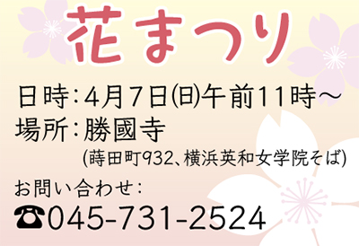 花まつりとは、お釈迦さまの誕生日を祝うもの。毎年4月に全国の寺で行われている。勝國寺ではもちつき大会などが行われる。同寺では「どなたでも無料で参加できますので、お気軽にお越しください。桜も楽しめます」と話している。詳細は勝國寺【電話】045・731・2524へ。