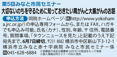 日本人に多い「胃がん」や「大腸がん」の予防や最新の治療法を、横浜市立みなと赤十字病院の専門医が分かりやすく解説する市民公開セミナーが6月22日(土)、中区の関内ホールで行われる。参加無料。