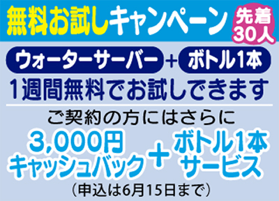 販売を行う「エルアクア湘南横浜」の竹内誠二さんは「全国で人気のコスモウォーターの良さを知ってほしいと思って企画しました」と同社は現在、無料お試しキャンペーンを実施中。1週間無料でサーバーとボトル1本(通常、1本1848円から)を試せる。その後に契約すれば3千円がキャッシュバックされ、ボトル1本がサービスされる。本紙読者先着30人の特別企画なのでお早めに。