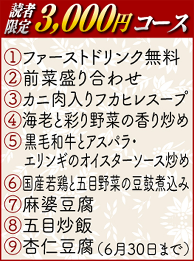 同店は化学調味料を使わず、丁寧に数種類の鶏ガラ、豚ガラ、野菜から旨みやコクを取り、麺スープのダシは日高昆布、野菜などから時間をかけて取る。コースは2500円から。プラス1000円で飲み放題(2時間)も。ランチは人気の麻婆豆腐や八宝菜セット、正油そばか塩そば+半炒飯セットなど、5種類以上が700円で土日も営業中。