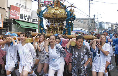 唐沢、中村町四丁目、三丁目、八幡町の各町内で威勢の良い掛け声とともにみこしを担ぐ姿が見られた。最終日の16日は八幡町の「宮本會」が担当し、担ぎ手が女性だけのみこしも登場。周辺からまかれる水を全身に浴びながら、神社周辺を堂々と進んだ。