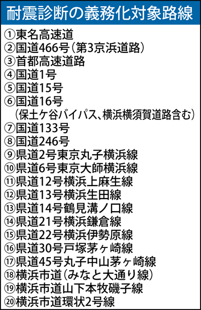 計画改定は11月25日、改正建築物耐震改修促進法が施行されたことに伴うもの。市ではこれを受け、市内に20路線あり、災害時に救急車や物資運搬車両の通行路として一般車両を規制する緊急交通路指定想定路線を、法による緊急輸送道路に指定。路線沿いにあり、古い耐震基準で建築された一定以上の高さの建物は耐震診断が義務化される。