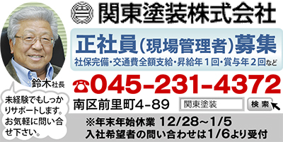 1927年の創業から、工事には「全身全霊で臨み、安易な妥協はしない」というポリシーの下、揺るぎない信頼を築き上げてきたのが前里町にある関東塗装。横浜市内を中心に、官庁関係や各種企業の塗装・防水工事を手掛けるほか、マンションなど集合住宅のリフォーム、戸建の塗装にいたるまで、幅広い工事を取り扱っている。