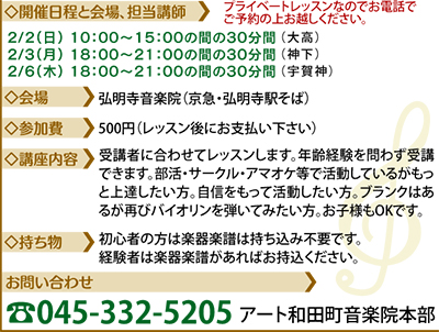 プライベートレッスンで「バイオリン」が学べる教室を「弘明寺音楽院」(弘明寺駅そば)が、主に初心者を対象に開講する。