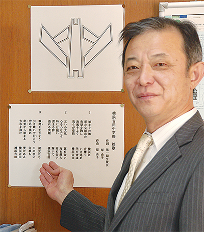 新たな校章もこのほど完成。こちらも夏休みに生徒から図案を募集し、30以上の中から3つに絞り、全校生徒の投票で決めた。「横」浜「吉」田の 2つの「Y」を両翼にし、中央にはランドマークタワーのイメージを配した。全体として将来に向かって枝葉を延ばす樹をイメージしている。