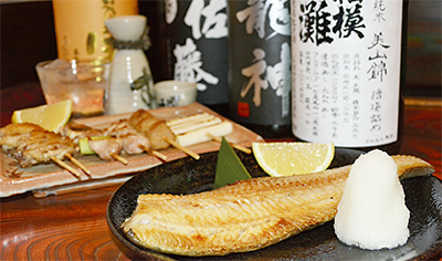 国産鶏の串焼き(120円〜)など、手ごろな価格で楽しめる料理も豊富。人気の一品はトロほっけ(650円)で、サクサクの皮と白身の隙間からじわりと溢れる脂が濃厚に広がる。 同僚や友人と楽しむ宴会コースも充実の内容だ。