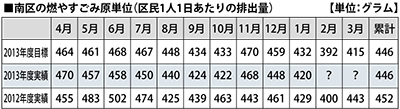 南区で昨年4月から今年1月までに出されたごみ量が公表され、燃やすごみの量が累計目標を下回った。2012年度の同時期と比べても大幅に減量が進んでおり、区が力を入れてきた削減への取り組みが実を結んでいる。