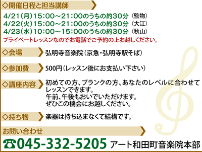 プライベートレッスンで「フルート」が学べる教室を「弘明寺音楽院」(京急・弘明寺駅そば)が、主に初心者を対象に開講する。