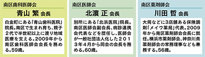 青山 医科と連携し、糖尿病と歯周病との関係などの研修会も行っている。また、南区と近隣区の医師会などが集まって、浦舟の横浜市大センター病院で行う協議に、歯科医師会、薬剤師会も参加している。