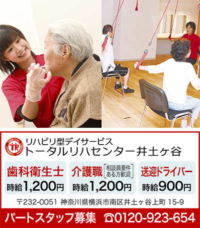 「介護保険で利用できるリハビリ」に特化したデイサービスを展開するデンタルサポート(株)(千葉県千葉市)。7月1日(火)、井土ヶ谷上町15の9に、身体だけでなく、独自の「口腔リハビリ」も受けられる「トータルリハセンター」を開所予定。作業療法士と歯科衛生士が常駐し「リハビリを行うことで、予防はもちろん回復を目指す」という。利用対象者は、介護保険の要支援または要介護認定を受けている人。