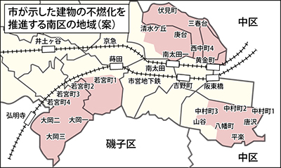 東日本大震災を踏まえ、市が13年10月に見直した地震被害想定では、火災による焼失棟数が約7万7700棟だった。特に木造住宅が密集している地域で被害が大きく、南区は約1万1800棟が焼失すると想定され、神奈川区に次いで2番目に多い。