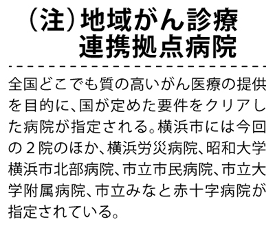浦舟町の横浜市立大学附属市民総合医療センター(市大センター病院)と恩賜財団済生会横浜市東部病院(鶴見区)が8月6日、厚生労働省から「地域がん診療連携拠点病院」(注)の指定を受けた。市内の拠点病院は7院となるが、市では今後も増やしたい考えだ。