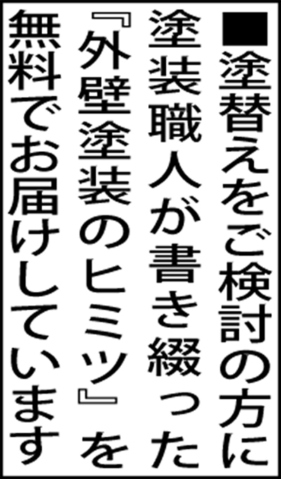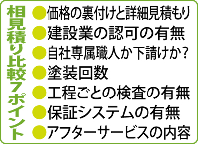 リフォームキングは、地域密着の塗替え専門店。外壁塗装を考えている人には、相見積りの際に参考になる冊子『外壁塗装のヒミツ』を進呈しているので、問合せてみたという。「担当の大町さんにお会いして、業者の比較ポイントまで教えていただきました。相見積りをとって検討し、最終的には対応の良さもあって大町さんにお願いしたんです」と笑顔。その時に教わった7ポイントが左表。冊子にはより詳しい情報が掲載されている。