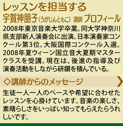 新しい趣味や習い事を気軽に発見してもらおうと、ワンコイン(500円)というリーズナブルな料金設定で企画されたこのレッスン。ギターや声楽などをテーマに毎回好評を博しており、今回は「バイオリン」について、同音楽院の実力派講師=写真が、大切な基本技術などを丁寧にレクチャーする(※詳細は左欄)。