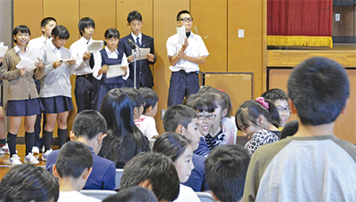 風紀委員長の福室慶祐君(3年)は「やってはいけない基本的なことを分かってほしい」と願い、山校長は「身近な『先輩』が良い手本を見せることで、小学生のうちから良いこと、悪いことが伝われば将来につながる」と感想を語った。