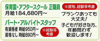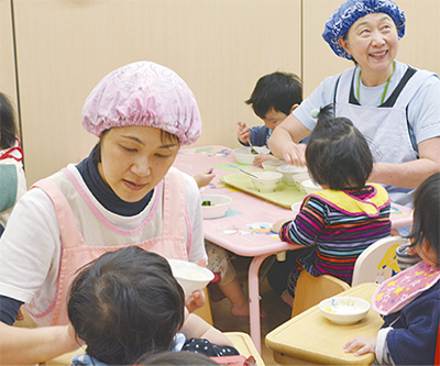 現在スタッフは20代〜60代と様々。勤務10年の黒(くろはばき) さん(60)は「子育てなどでブランクがあっても丁寧に教えるから心配ありません。秋に園舎が新しくなるのでスタッフみんなワクワクです」と充実した様子。佐藤園長は「正職員のほか、子ども好きのパート・アルバイトさんも歓迎。明るい笑顔に囲まれて一緒に働きませんか」と呼びかける。
