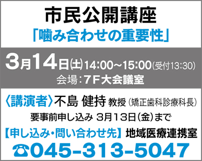 時間は午後2時から3時まで。希望者は3月13日(金)までに地域医療連携室【電話】045・313・5047へ事前申し込みを。また、当日講座終了後には、3月31日まで開催している無料相談会の予約受付も行う。