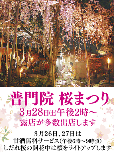 しだれ桜の開花中は今年もライトアップを実施。3月26日、27日には甘酒無料サービスもある。拝田住職は「光輝く夜桜は格別です。気軽に立ち寄っていただけたら」と呼びかける。