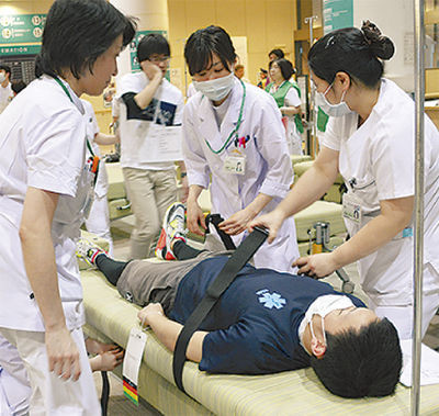 災害時の職員連携や対応能力向上のために実施。災害拠点病院に指定される同院には大規模地震などが発生した場合、被災者の救護活動などが求められている。