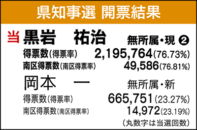 県知事選は南区でも黒岩祐治氏が7割を超える票を獲得し、強さを見せた。