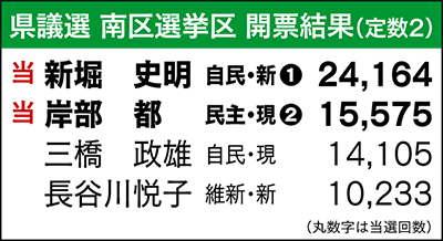 県議選南区選挙区(定数2)は、現職2人、新人2人の4人で争われ、自民党の新人・新堀史明氏(51)がトップ当選、民主党の現職・岸部都氏(56)が続いた。自民党の現職・三橋政雄氏(45)は議席を失い、維新の党の新人・長谷川悦子氏(38)も届かなかった。
