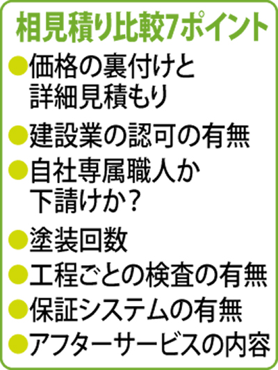 外壁の塗替えを検討する際、意外と実践する人が少ない「相見積り」について「最低でも3社以上から取り寄せるのが鉄則ですよ!」と推奨する同社が教える「比較7ポイント」(表)などが記載されたこの一冊。