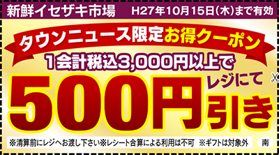 また、カード会員が1万5千人を突破したことを記念して、本日9月25日(金)から27日(日)の3日間、ポイント5倍デーを実施。クーポンとの併用もOK。この機会にポイントカード会員になって「新鮮イセザキ市場デビュー」してみては。