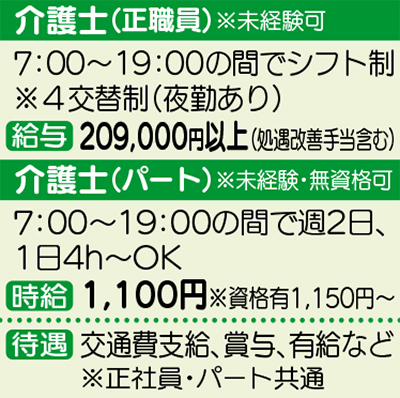 社会福祉法人楠会が母体の同所は、多機能の事業所を併設した安定経営と待遇面も魅力。研修制度もあって安心して働ける。送迎ドライバーや清掃スタッフも同時募集中。詳細は左記へ。