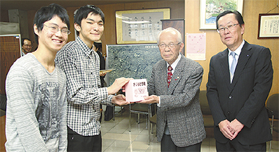 同校は2013年の移転前から横総祭の売上金を同振興会に寄付している。この日は生徒会執行部の北井雅人君(3年)と大場祐希君(2年)が区長室で同振興会の大津幸雄会長に寄付金を手渡した。
