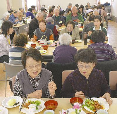 独居の高齢者などに料理を囲んで交流してもらおうと約40年前から行われている。当日は六ツ川地区の住民100人が参加。ハンバーグやスープなどを食べて会話を楽しんだ。30年前から参加する島田満子さん(93)は「昔は料理を作る側だったが今では食べる側に。毎回みなさんと会話できることが嬉しい」と話した。