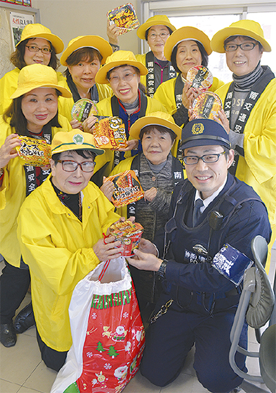 北永田交通安全母の会(上田トキ子会長)が12月17日、南警察署永田交番に勤務する警察官にカップ麺25個を差し入れた。