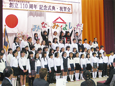 市立南吉田小学校(藤本哲夫校長、児童698人)が創立110周年を迎えたことを祝う記念式典と祝賀会が2月20日、同校体育館で開かれ、地域住民や保護者、学校関係者ら約200人が参加した。
