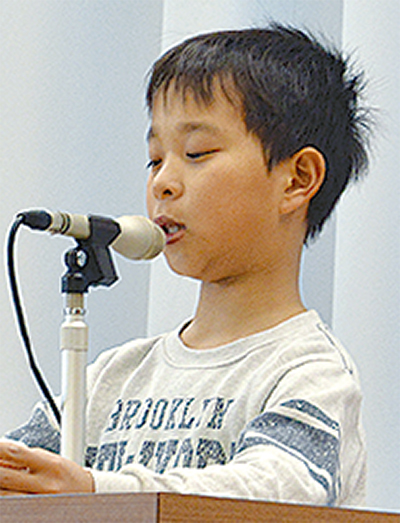 25日の修了式で16年度のキーワード「スカイ」を発表した5年生児童は「『空』は無限に広がる可能性を持つ。思いやり・協力・優しさの3つで団結したい」と決意を新たにした。