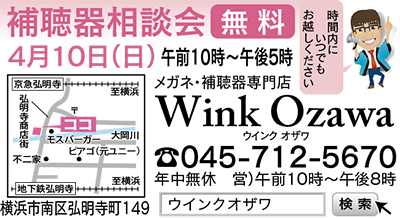京急・地下鉄弘明寺駅から徒歩5分。弘明寺商店街内にある認定補聴器専門店「Wink Ozawa(ウインクオザワ)」が4月10日(日)、無料の補聴器相談会を開催する。
