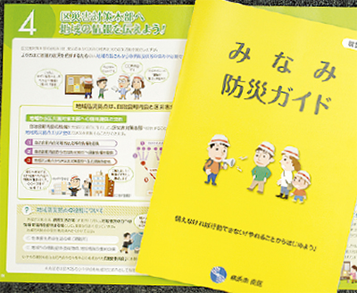 南区は3月、自治会町内会の共助活動促進を目的にしたガイドブック「みなみ防災ガイド共助編」を作成した。ガイドはA4判12ページ。災害発生後に近所で安否確認をする方法や要援護者の移送など、共助の活動例が示されている。